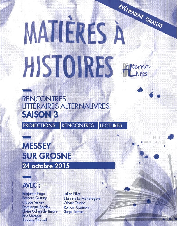 Serge Safran, en compagnie d'Éloïse Cohen de Timary, participe aux rencontres littéraires Alternalivres « Matières à histoires » le samedi 24 octobre 2015.